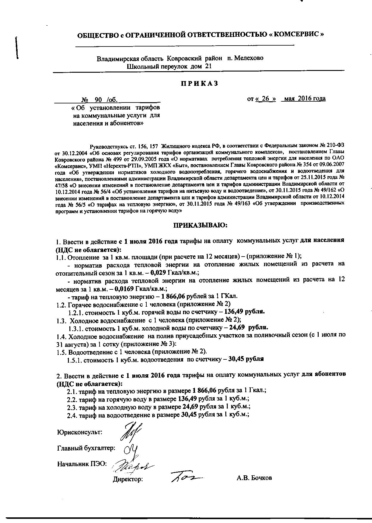 - Приказ по тарифам ООО "Комсервис"