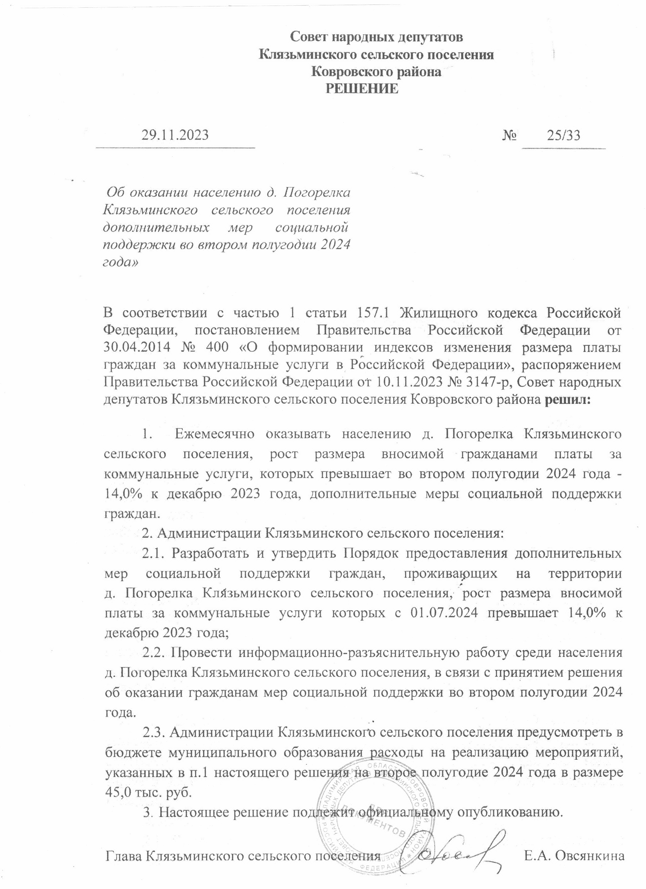 - Решение об оказании населению д. Погорелка Клязьменского сельского поселения дополнительных мер социальной поддержки во втором полугодии 2024 года